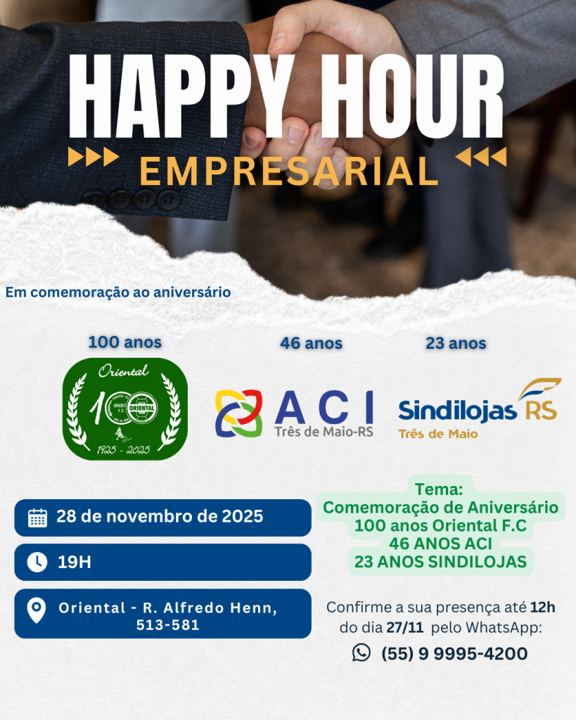 É com grande prazer que convidamos vocês para mais uma edição do Happy Hour Empresarial, em comemoração aos 100 anos do Oriental Futebol Clube, 46 anos da ACI e 23 anos do Sindilojas ! 🎉