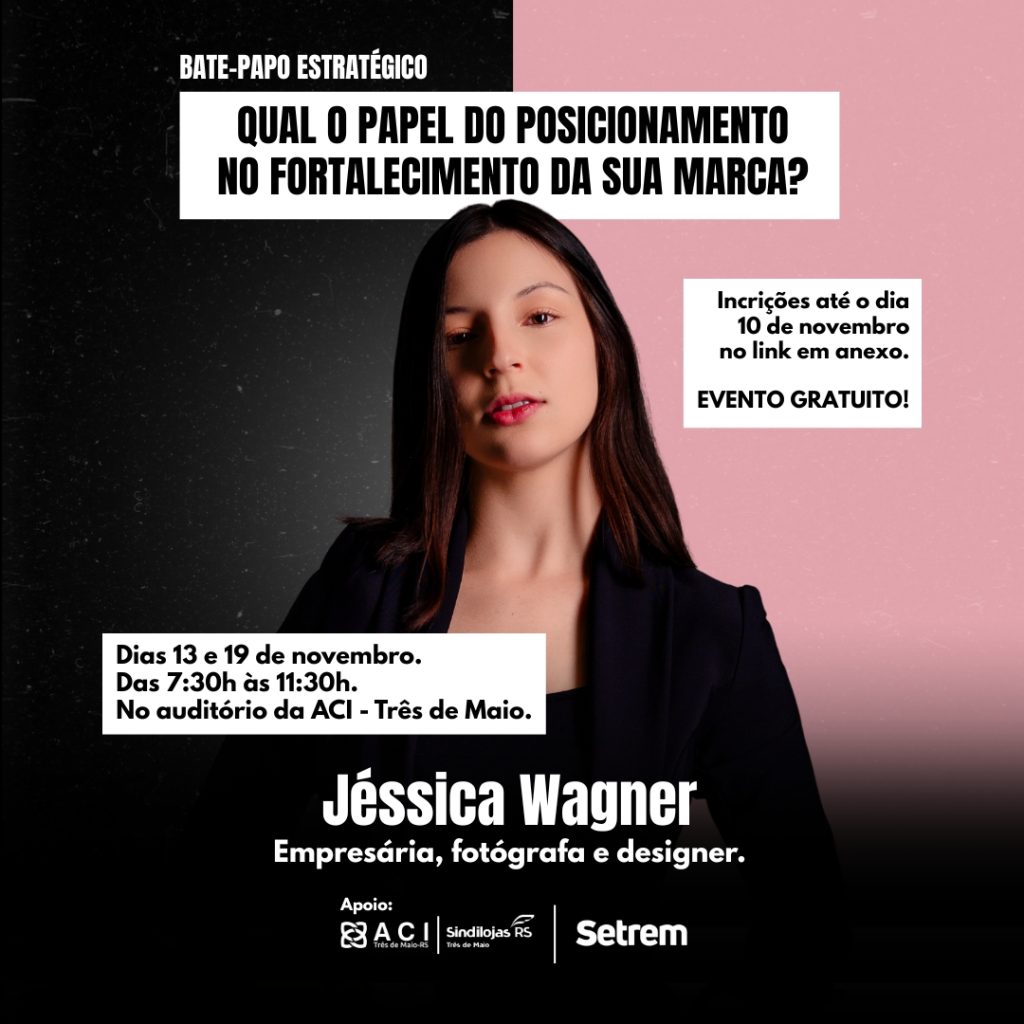 “Qual o papel do posicionamento no fortalecimento da sua marca?” Esse é o tema de um bate-papo promovido pela designer e fotógrafa Jéssica Wagner. Um momento voltado para quem deseja fortalecer sua marca e entender como o posicionamento pode transformar o seu negócio, por meio da imagem e da comunicação. 📅 Nos dias 13 e 19 de novembro. ⏰ Das 7h30 às 11h30. 📍 No Auditório da ACI — Três de Maio. 💰 Evento 100% gratuito e aberto ao público! As inscrições vão até o dia 10 de novembro pelo link abaixo 👇 (VAGAS LIMITADAS!) https://logos.setrem.com.br/informacoes_evento.aspx?s=W8YgS9fi9RZcAmrgsMz8cA%3d%3d Garanta sua vaga e vem viver essa experiência que vai alavancar a sua marca! 🎯